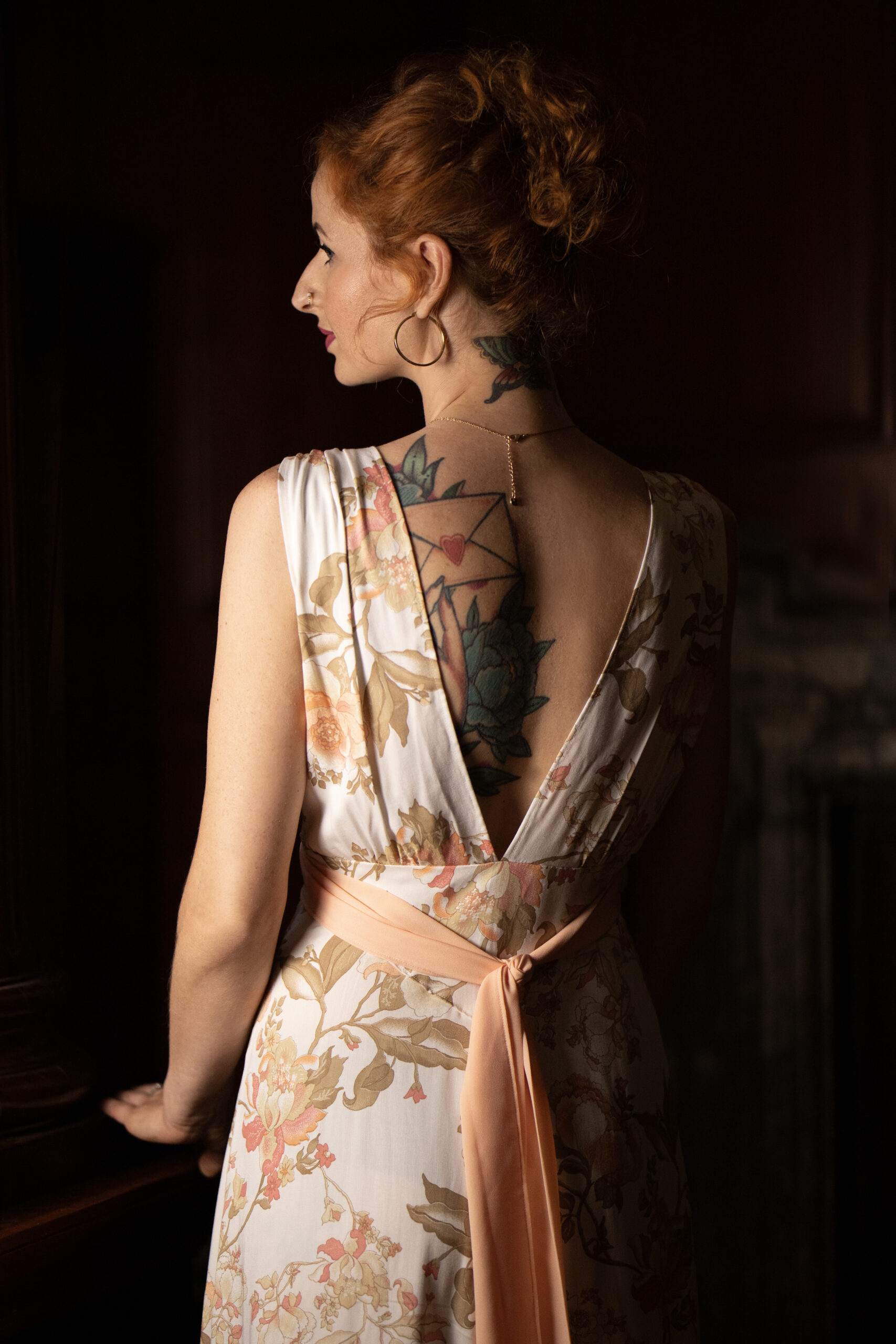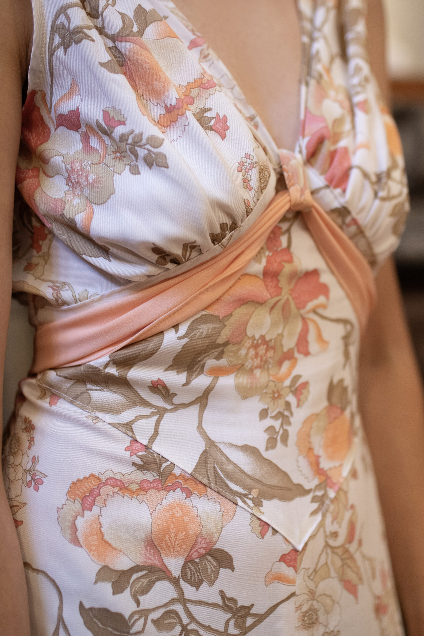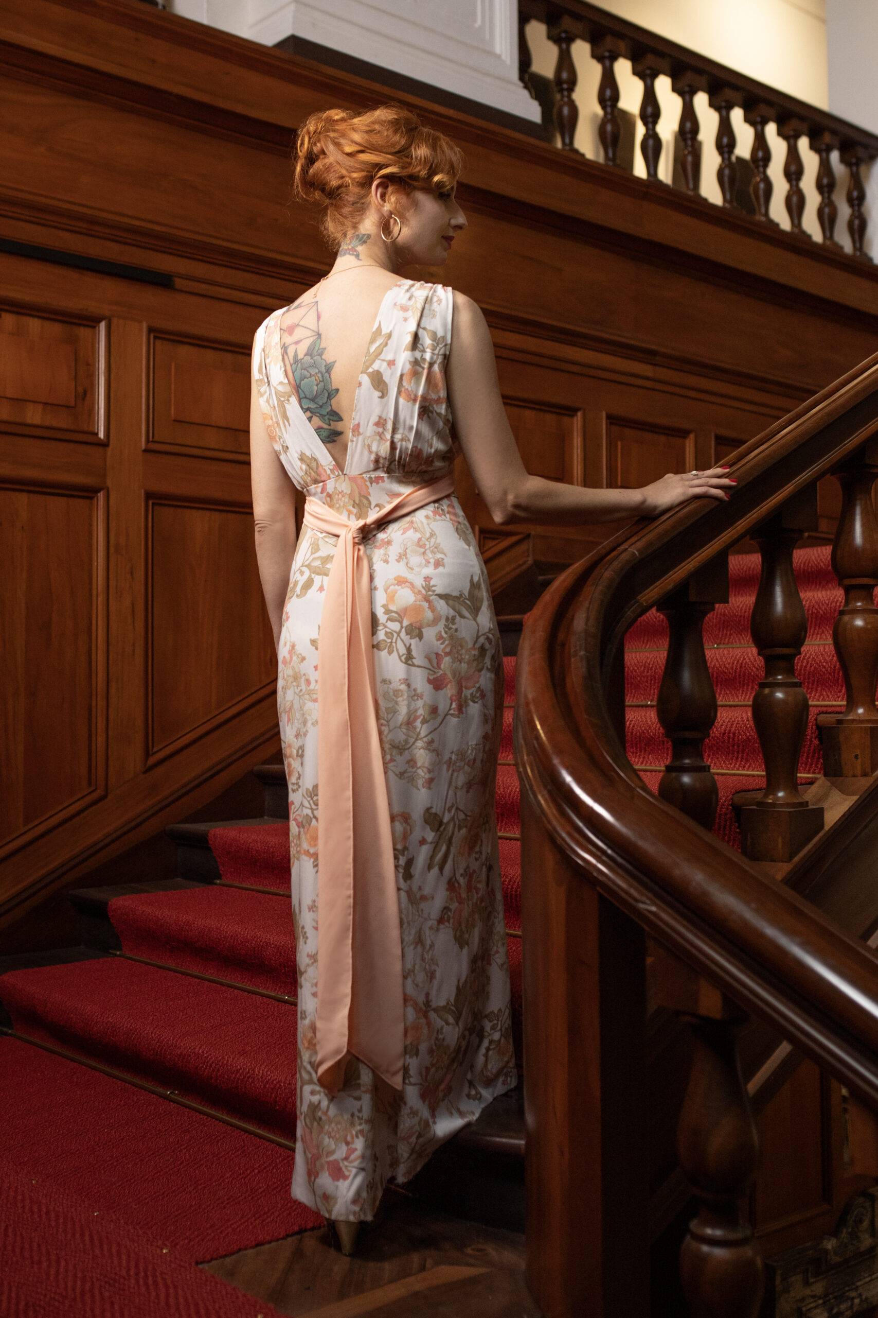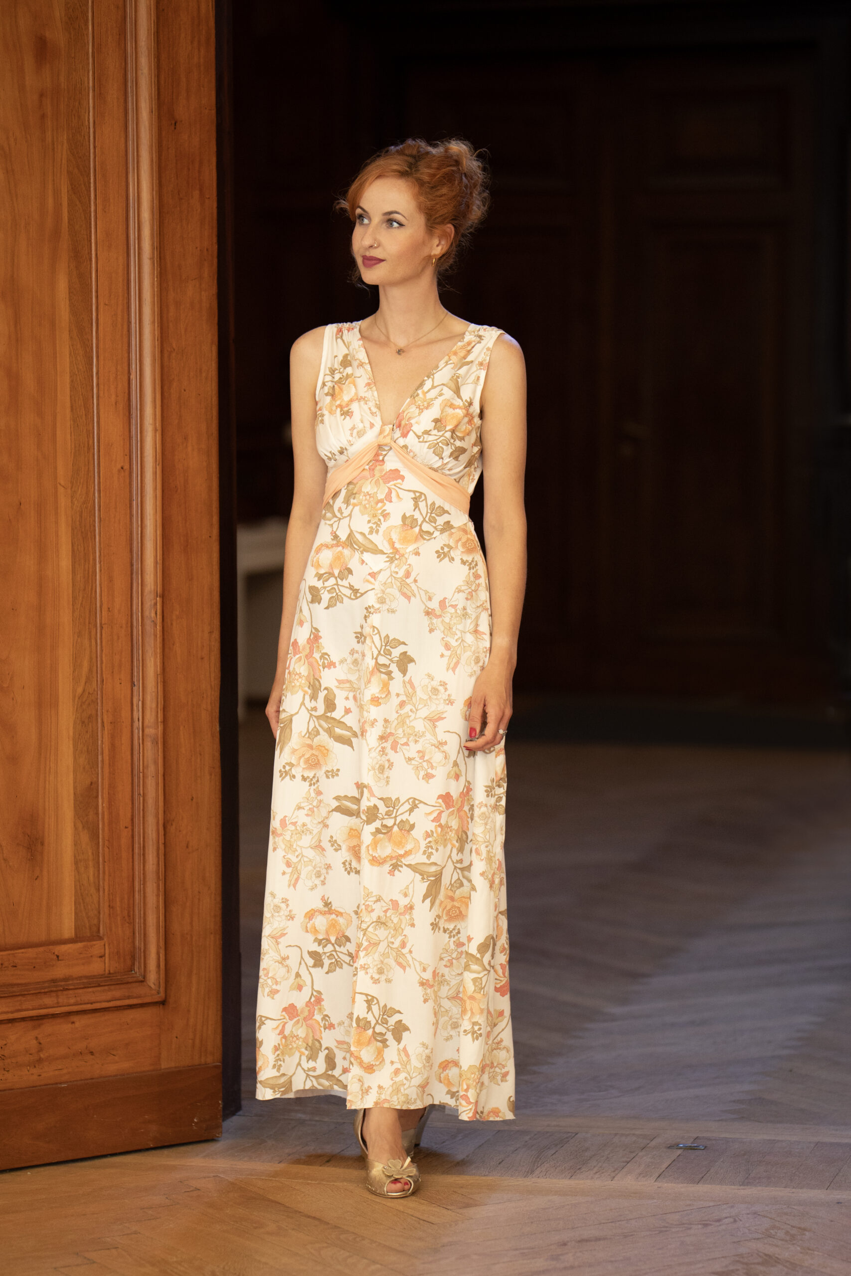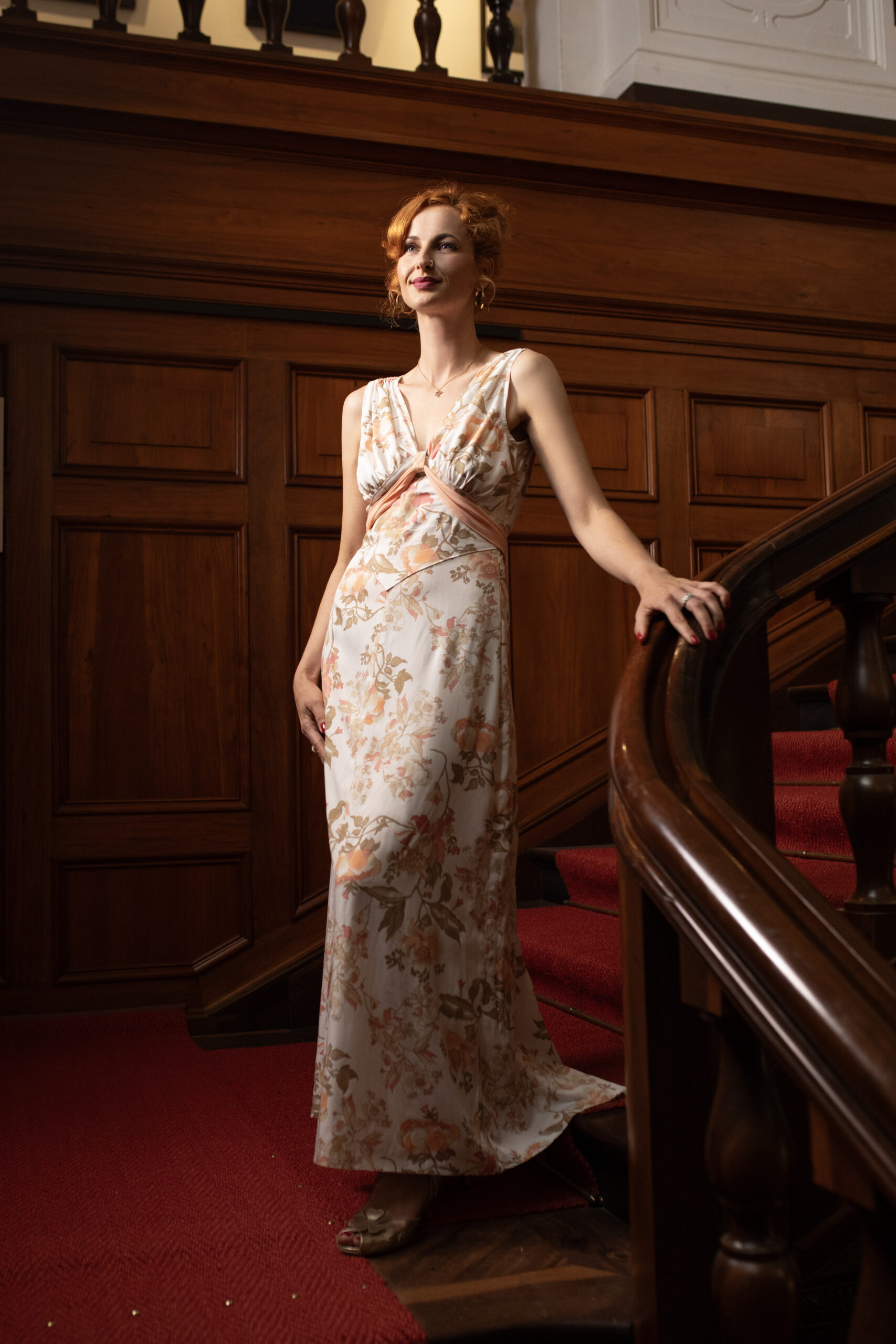 Elegantes 30er-Jahre Kleid aus Viskose in ivory mit Blütenmuster. Typisch für diese Zeit sind die geraffte Schulterpartie sowie der tiefe Rückenausschnitt. Ein langer Schal, der farblich in apricot abgesetzt wurde, wird ausgehend vom Dekolleté im Rücken gebunden.