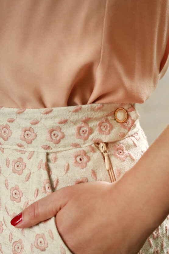 High Waist Shorts im 50er-Jahre Stil aus cremefarbenem hochwertigen Leinen mit rosa Lochstickerei.